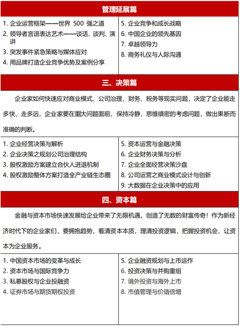 无论您处在哪一个行业,无论您的企业是大是小,北京大学企业管理素养(EMD)研修班全新的管理思维,将帮您探究突破瓶颈的有效路径。可以让您明确方向,掌握竞争成功之道,确立市场优势地位,告诉企业向何处去?怎样去?如何提高竞争力?并有效地达到目标,保持持续的赢利能力。如果您还在经营的隧道中痛苦地跋涉,对未来感到迷惘,在这里,我们将与您共同探索新经济时代企业经营的全新理念,破除传统管理的迷思,破解全球最卓越企业的成功基因,把握新经济时代经营制胜的法则,开创 21 世纪企业管理者的必修课程。