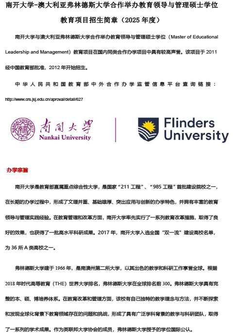 南开大学与澳大利亚费林德斯大学教育学招生简章