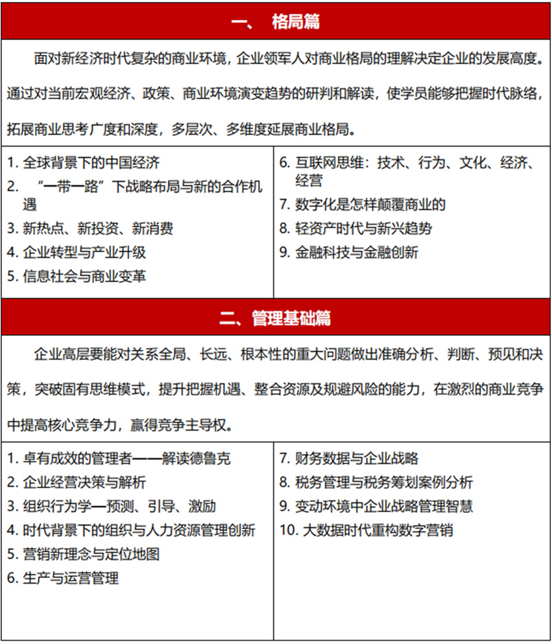 无论您处在哪一个行业,无论您的企业是大是小,北京大学企业管理素养(EMD)研修班全新的管理思维,将帮您探究突破瓶颈的有效路径。可以让您明确方向,掌握竞争成功之道,确立市场优势地位,告诉企业向何处去?怎样去?如何提高竞争力?并有效地达到目标,保持持续的赢利能力。如果您还在经营的隧道中痛苦地跋涉,对未来感到迷惘,在这里,我们将与您共同探索新经济时代企业经营的全新理念,破除传统管理的迷思,破解全球最卓越企业的成功基因,把握新经济时代经营制胜的法则,开创 21 世纪企业管理者的必修课程。