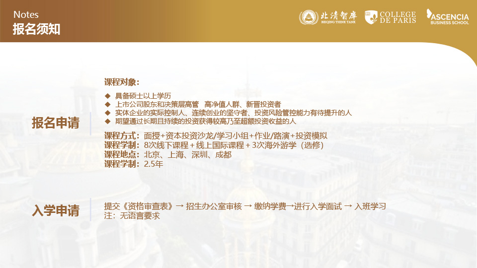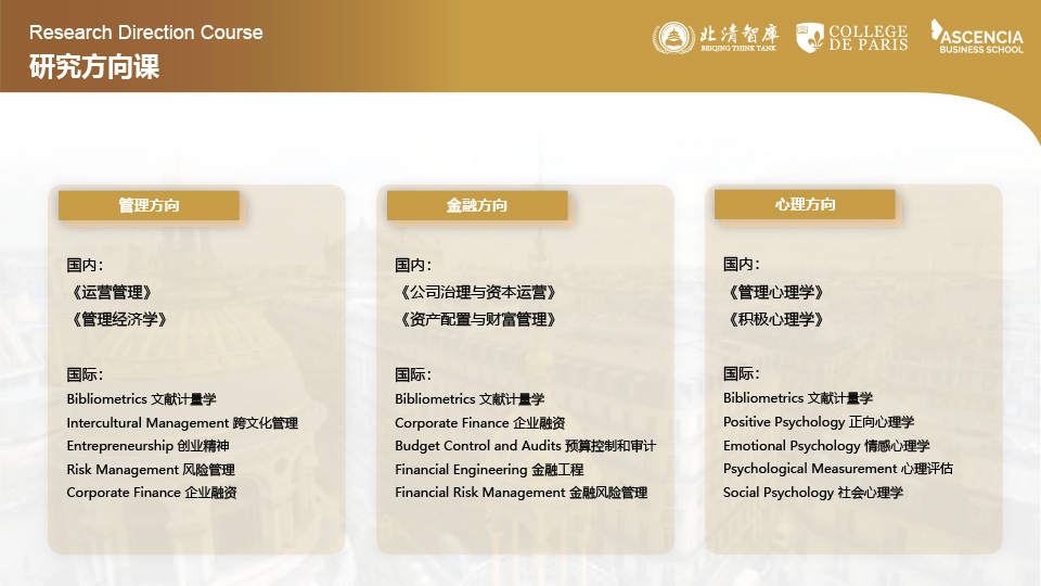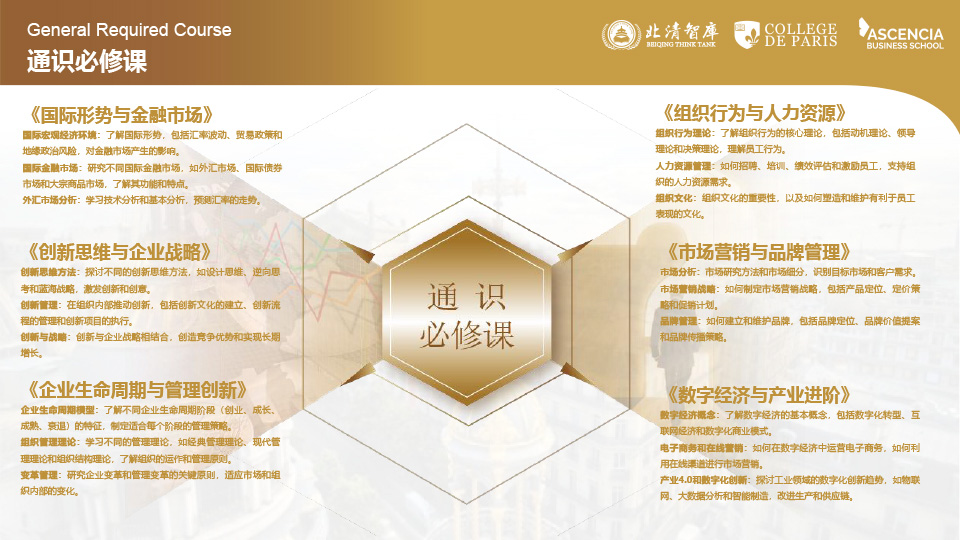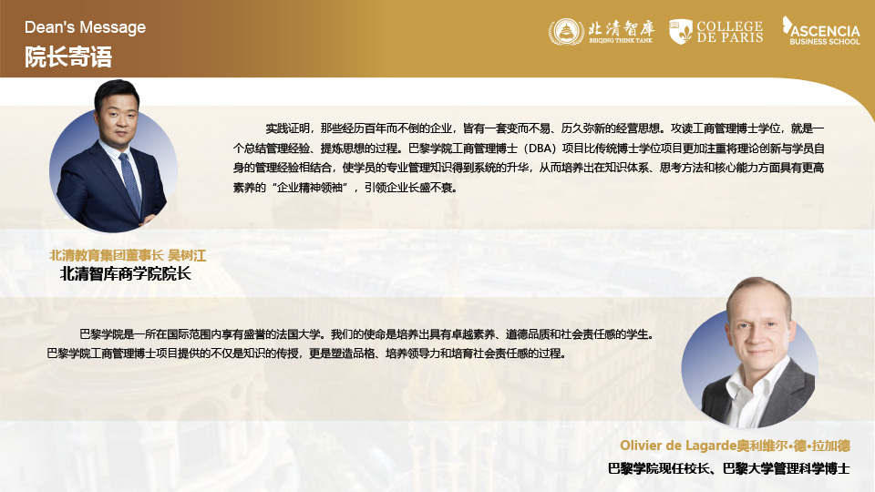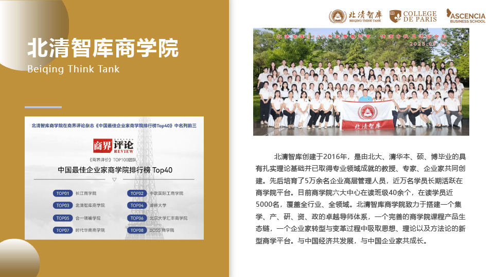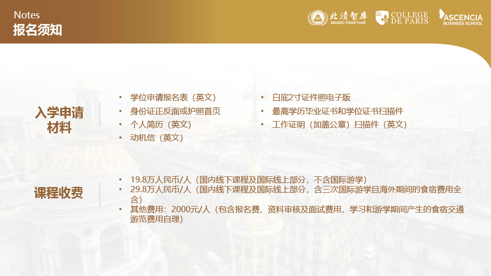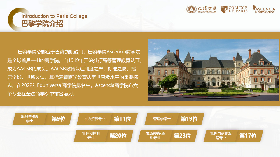 巴黎学院总部位于巴黎新凯旋门,巴黎学院Ascencia商学院是全球首屈一指的商学院,自1919年开始推行高等管理教育认证,成为AACSB的成员。AACSB教育认证制度之严、标准之高、冠居全球,世所公认,其代表着商学教育达至世界级水平的重要标志。在2022年Eduniversal商学院排名中,Ascencia商学院有六个专业在全法商学院中排名前列。
