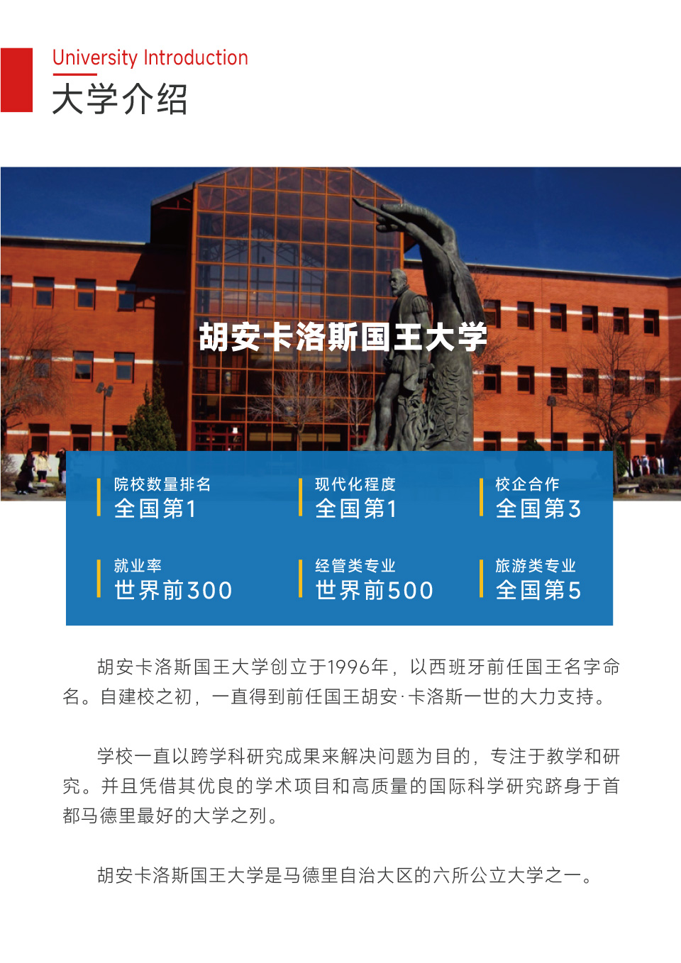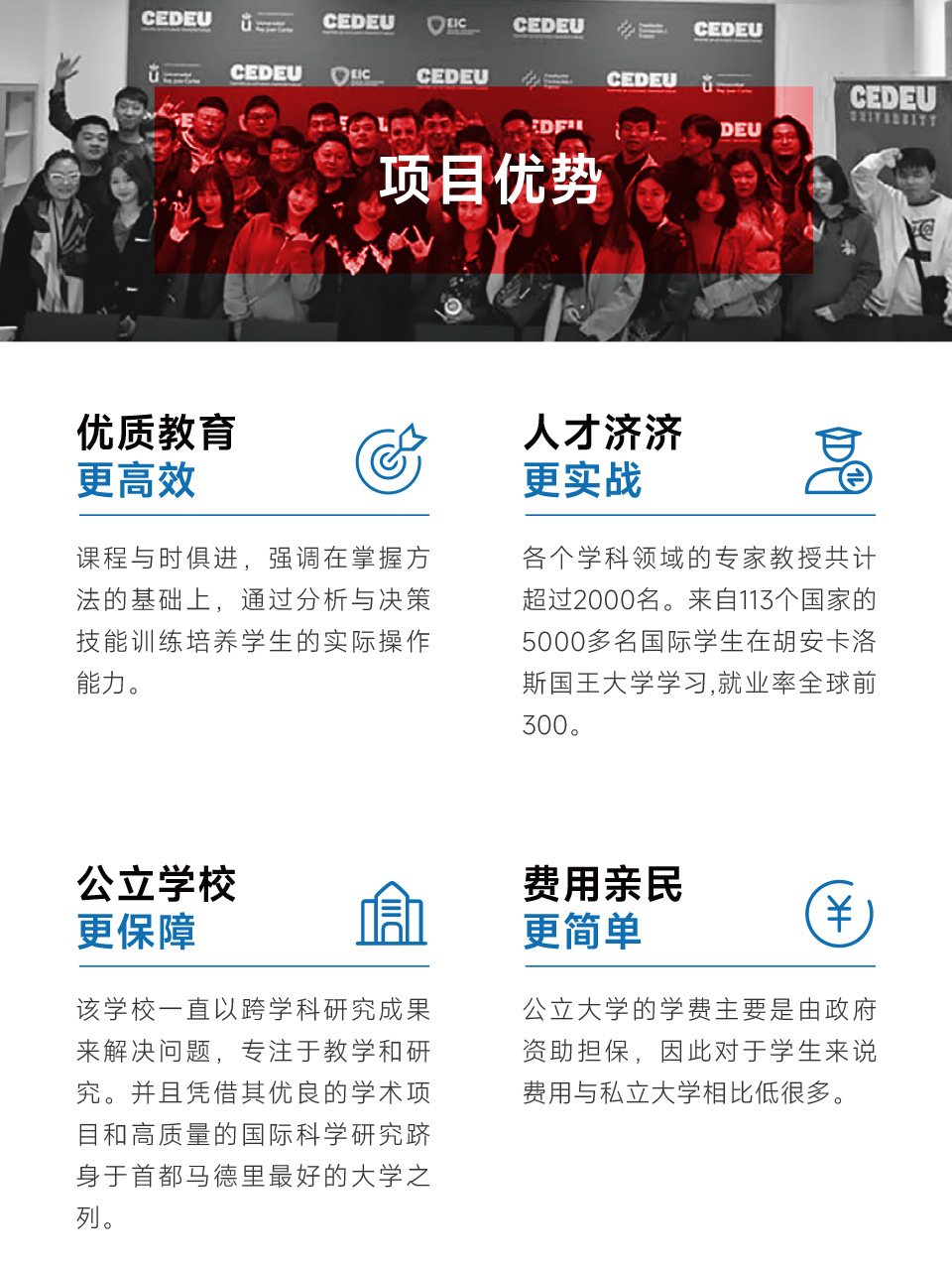 CEDEU学院是根据目前西班牙监管:标准创建的大学学院中心,隶属于马德里的胡安卡洛斯国王大学,主要负责经管和社会科学领域的教学、研究、技术咨询及知识传播。CEDEU大学研究中心的创建目的是为了满足人们和社会在任何时候所出现的培训需求,致力于创造社会价值,在创造、传播、保护和应用知识方面实现包容、传播和卓越的一所大学中心。