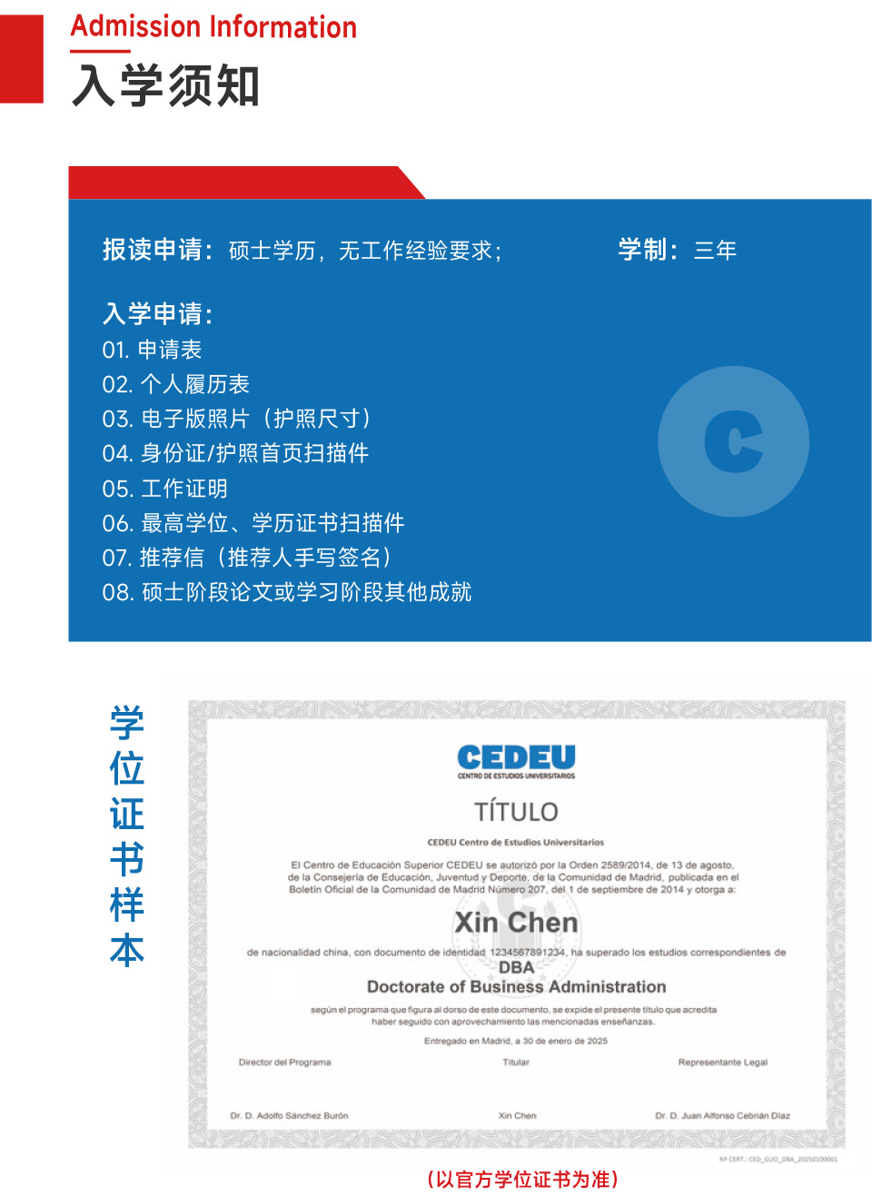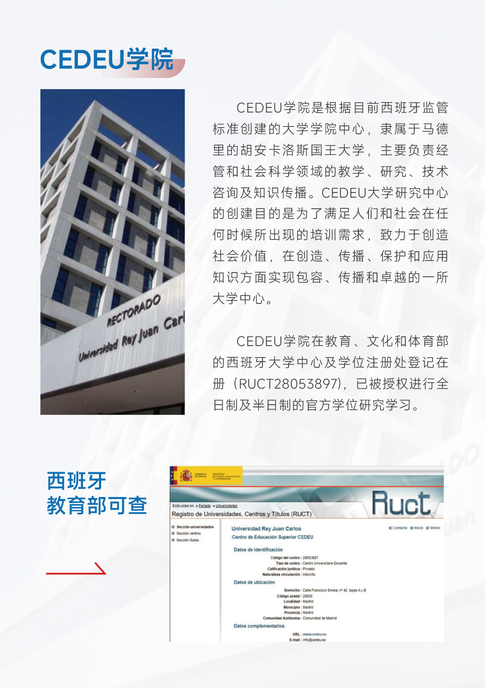 CEDEU学院在教育、文化和体育部的西班牙大学中心及学位注册处登记在册(RUCT28053897),已被授权进行全日制及半日制的官方学位研究学习。