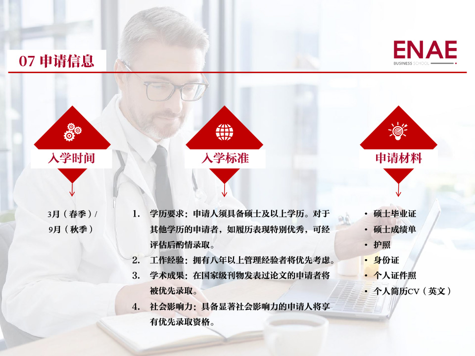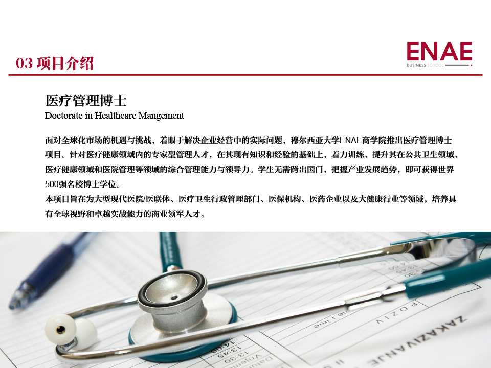 面对全球化市场的机遇与挑战,着眼于解决企业经营中的实际问题,穆尔西亚大学ENAE商学院推出医疗管理博士项目。针对医疗健康领域内的专家型管理人才,在其现有知识和经验的基础上,着力训练、提升其在公共卫生领域、医疗健康领域和医院管理等领域的综合管理能力与领导力。学生无需跨出国门,把握产业发展趋势,即可获得世界500强名校博士学位。