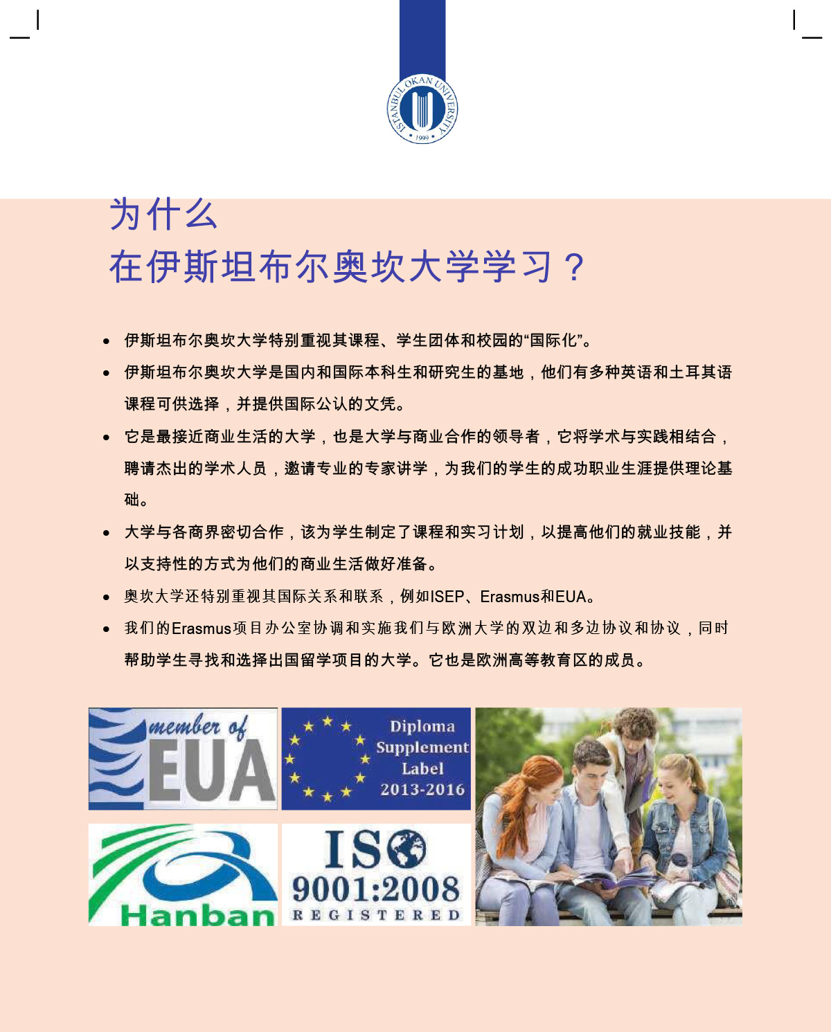 大学与各商业部门紧密合作,制定课程和实习计划,以提高学生的就业能力。除了现代学术教育,我们的学生在伊斯坦布尔奥坎大学与商业世界有密切的接触。这是最接近我国商业的大 学。因此,我们的国际学生将能够与世界各地的所有同龄人竞 争,并有幸参与联合项目和合作。