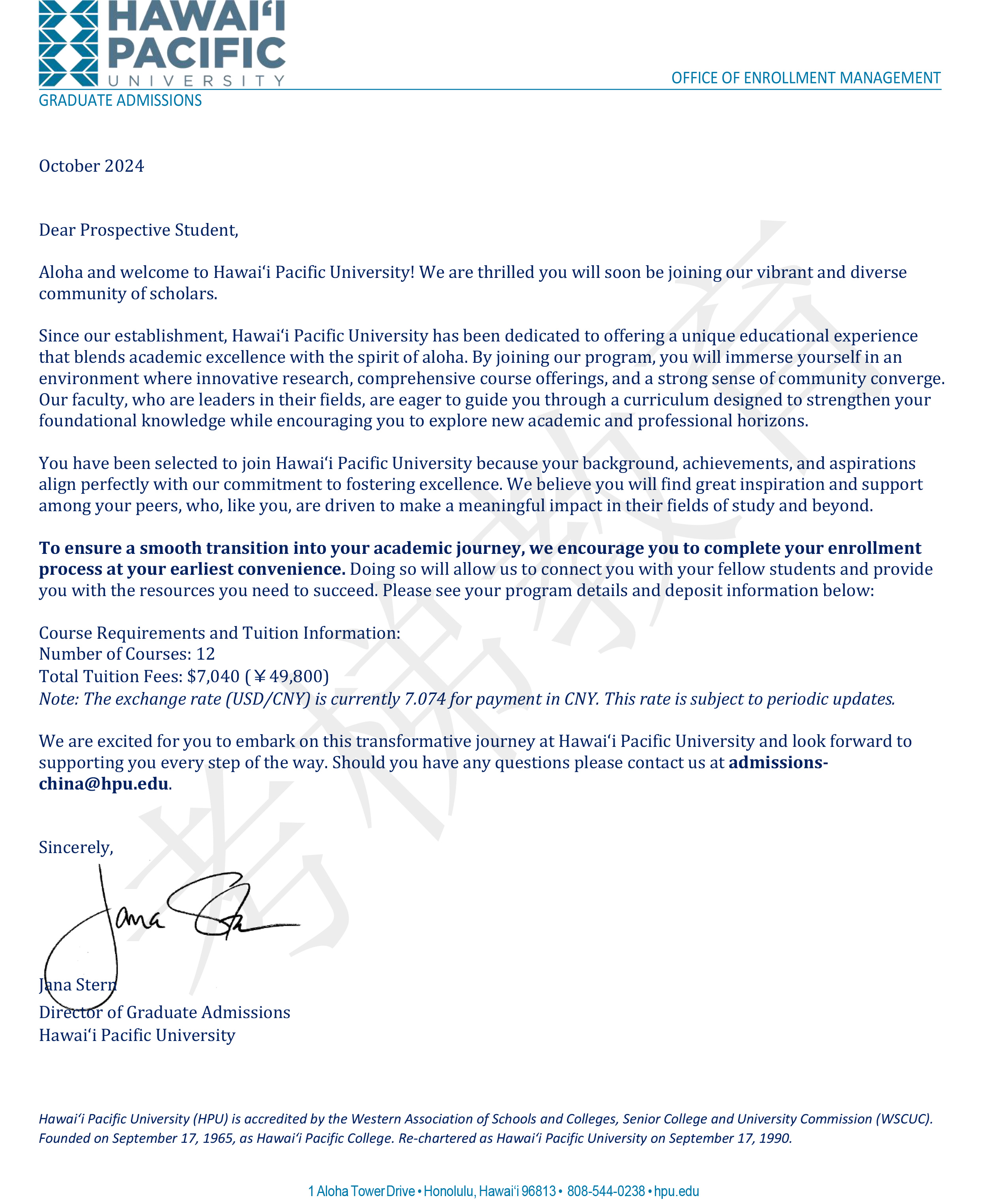 HPU 夏威夷太平洋大学 MBA 工商管理硕士 Payment letter
