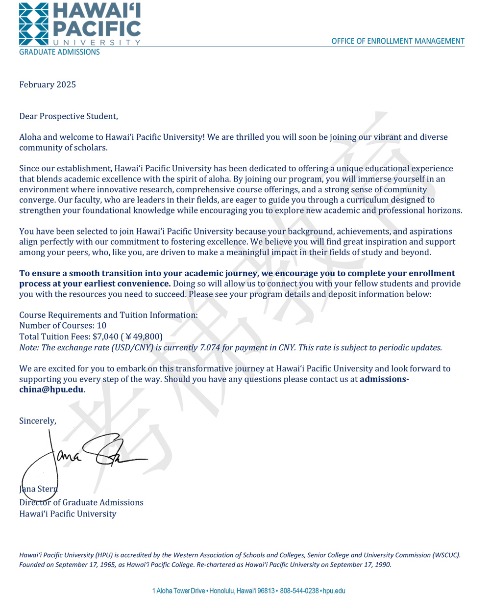 HPU 夏威夷太平洋大学 MSAI 人工智能硕士 Payment Letter
