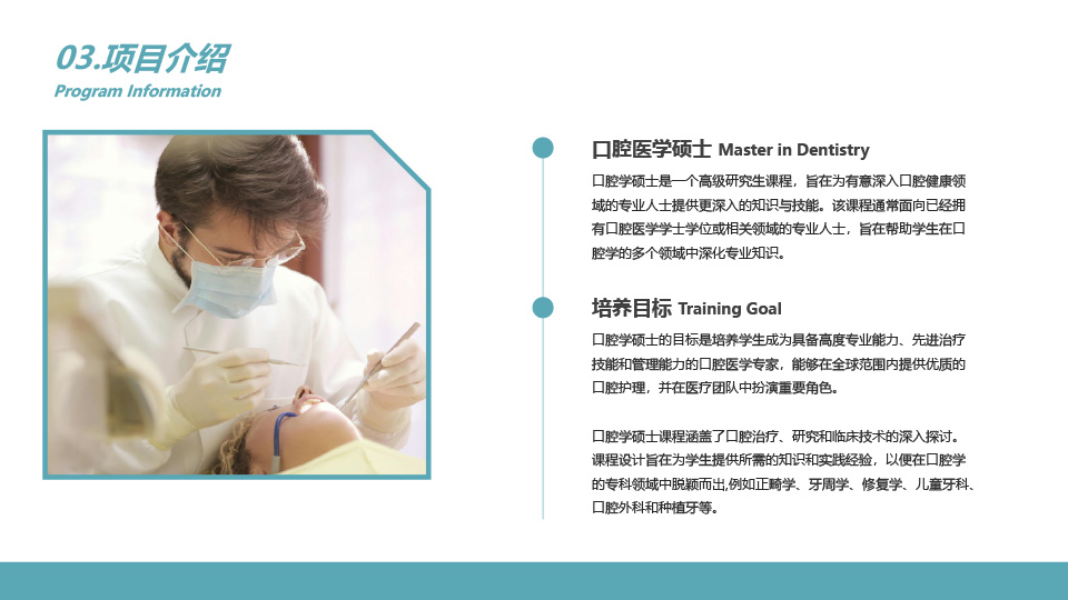 口腔学硕士的目标是培养学生成为具备高度专业能力、先进治疗技能和管理能力的口腔医学专家,能够在全球范围内提供优质的口腔护理,并在医疗团队中扮演重要角色。