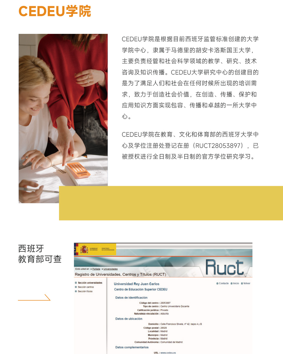CEDEU学院在教育、文化和体育部的西班牙大学中心及学位注册处登记在册(RUCT28053897),已被授权进行全日制及半日制的官方学位研究学习。