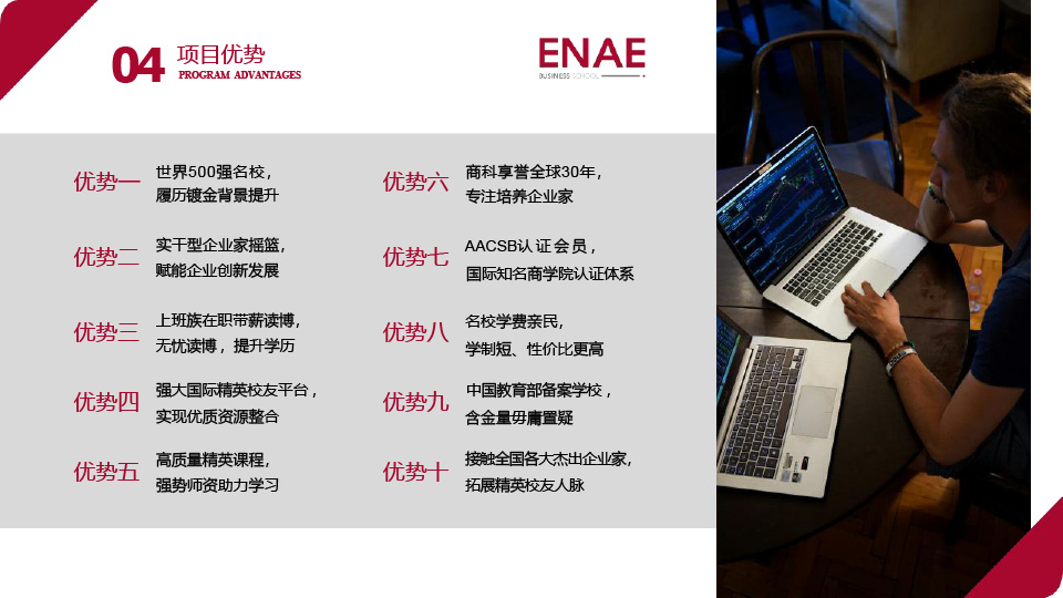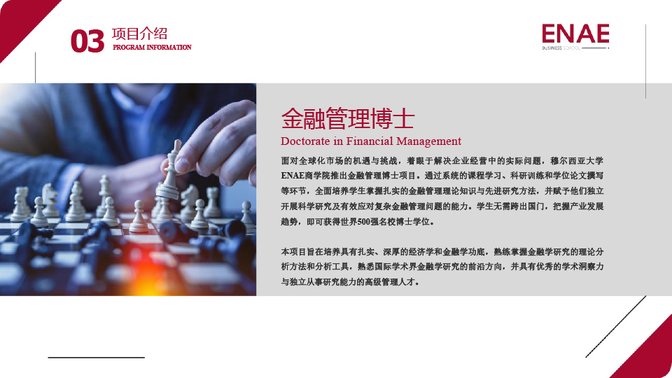 面对全球化市场的机遇与挑战,着眼于解决企业经营中的实际问题,穆尔西亚大学ENAE商学院推出金融管理博士项目。通过系统的课程学习、科研训练和学位论文撰写等环节,全面培养学生掌握扎实的金融管理理论知识与先进研究方法,并赋予他们独立开展科学研究及有效应对复杂金融管理问题的能力。学生无需跨出国门,把握产业发展趋势,即可获得世界500强名校博士学位。