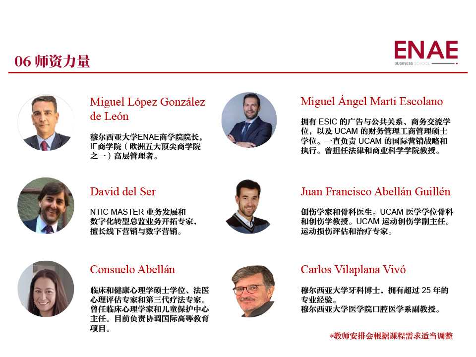 面对全球化市场的机遇与挑战,着眼于解决企业经营中的实际问题,穆尔西亚大学ENAE商学院推出医疗管理博士项目。针对医疗健康领域内的专家型管理人才,在其现有知识和经验的基础上,着力训练、提升其在公共卫生领域、医疗健康领域和医院管理等领域的综合管理能力与领导力。学生无需跨出国门,把握产业发展趋势,即可获得世界500强名校博士学位。