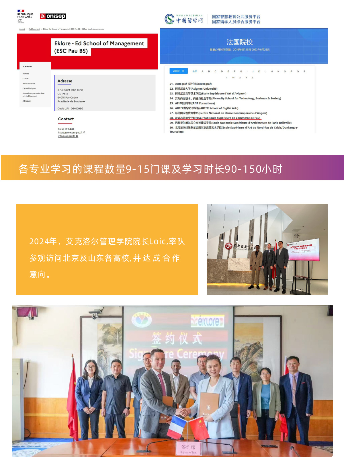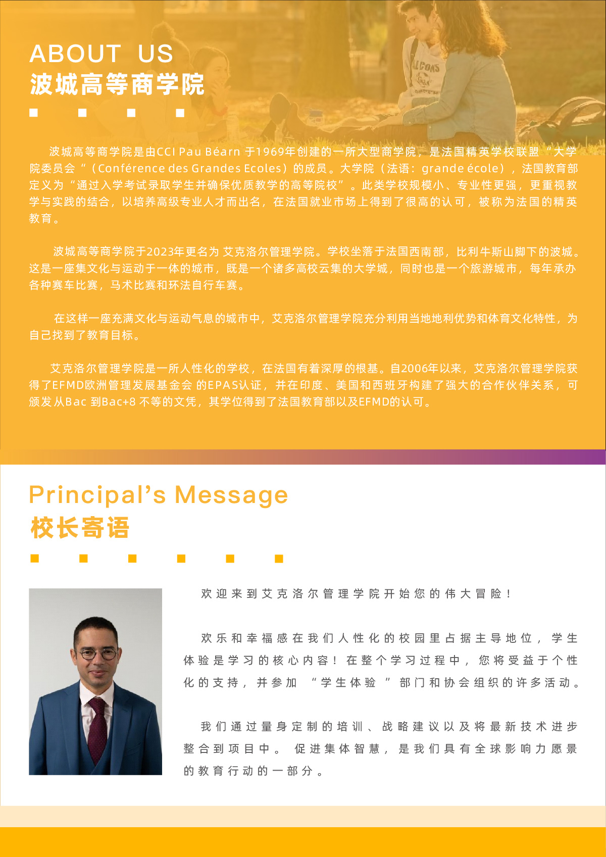 波城高等商学院是由CCIPau Bearn于1969年创建的一所大型商学院,是法国精英学校联盟“大学院委员会“(Conferencedes Grandes Ecoles)的成员。大学院(法语:grandeecole),法国教育部定义为“通过入学考试录取学生并确保优质教学的高等院校”。此类学校规模小、专业性更强,更重视教学与实践的结合,以培养高级专业人才而出名,在法国就业市场上得到了很高的认可,被称为法国的精英教育。