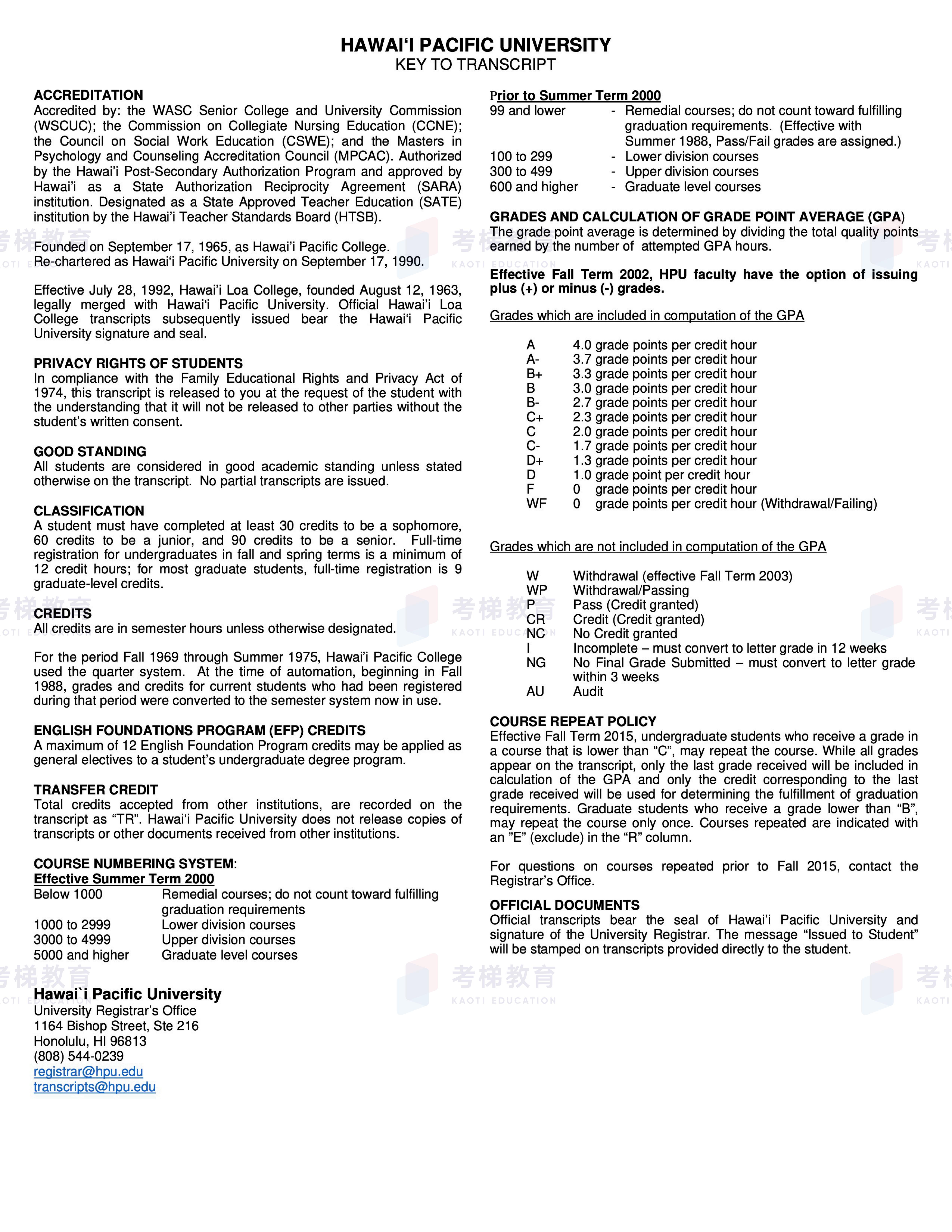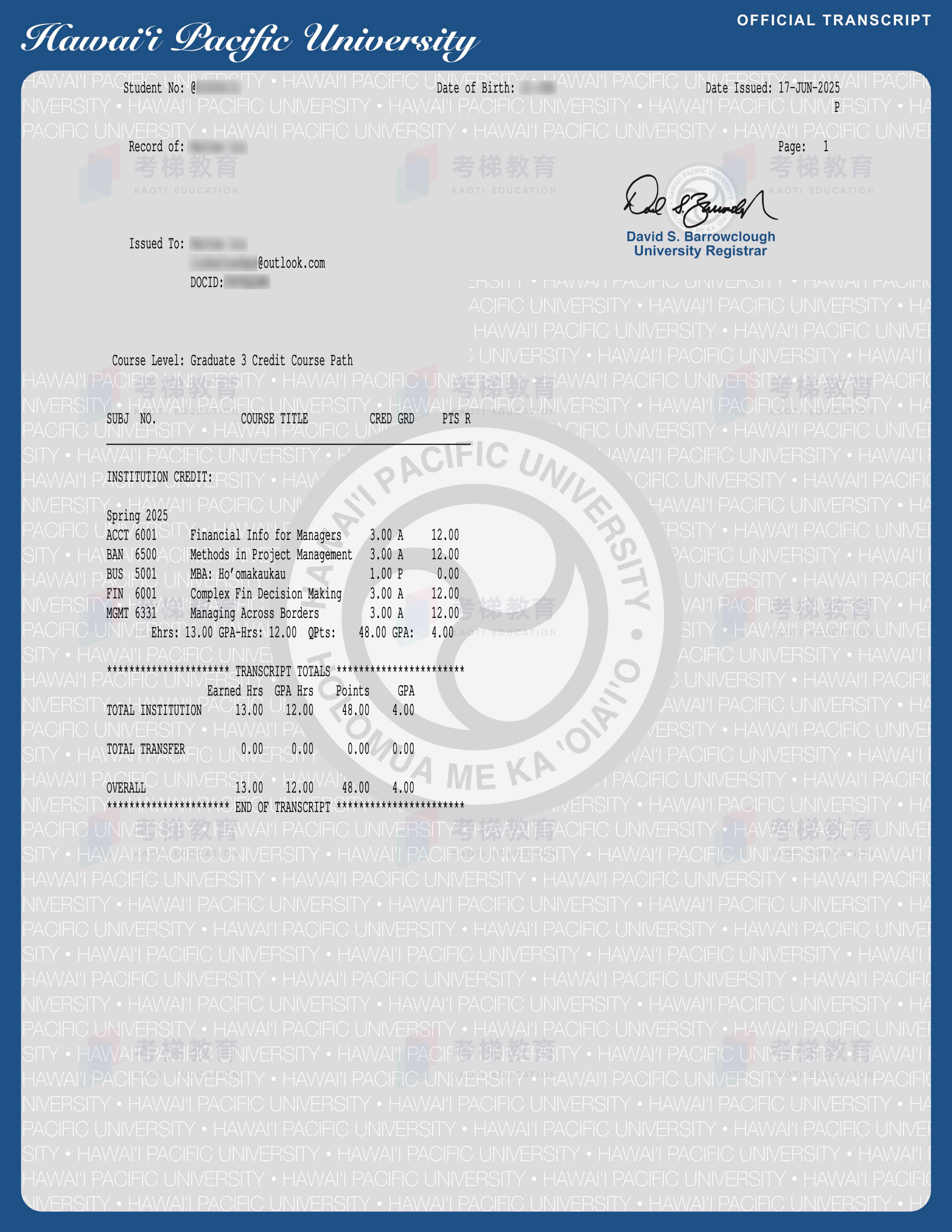 HPU 夏威夷太平洋大学 MBA 工商管理硕士 成绩单